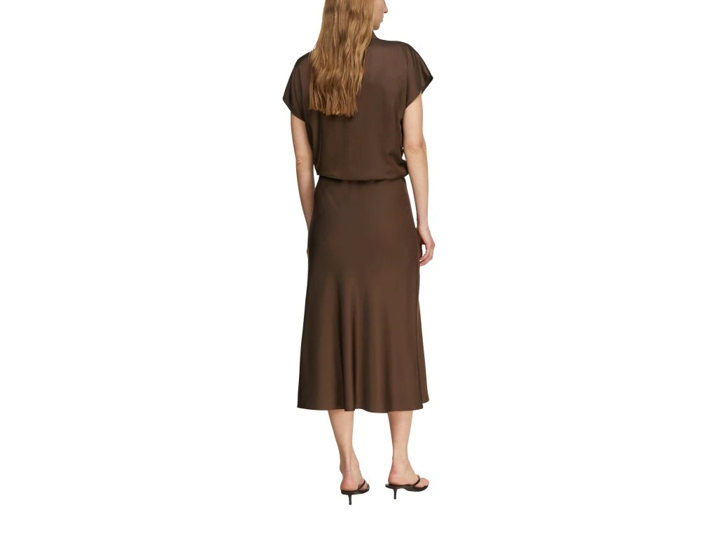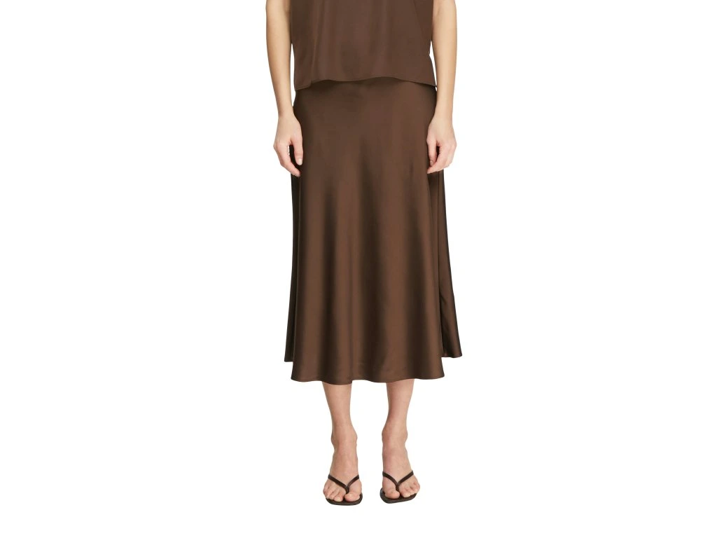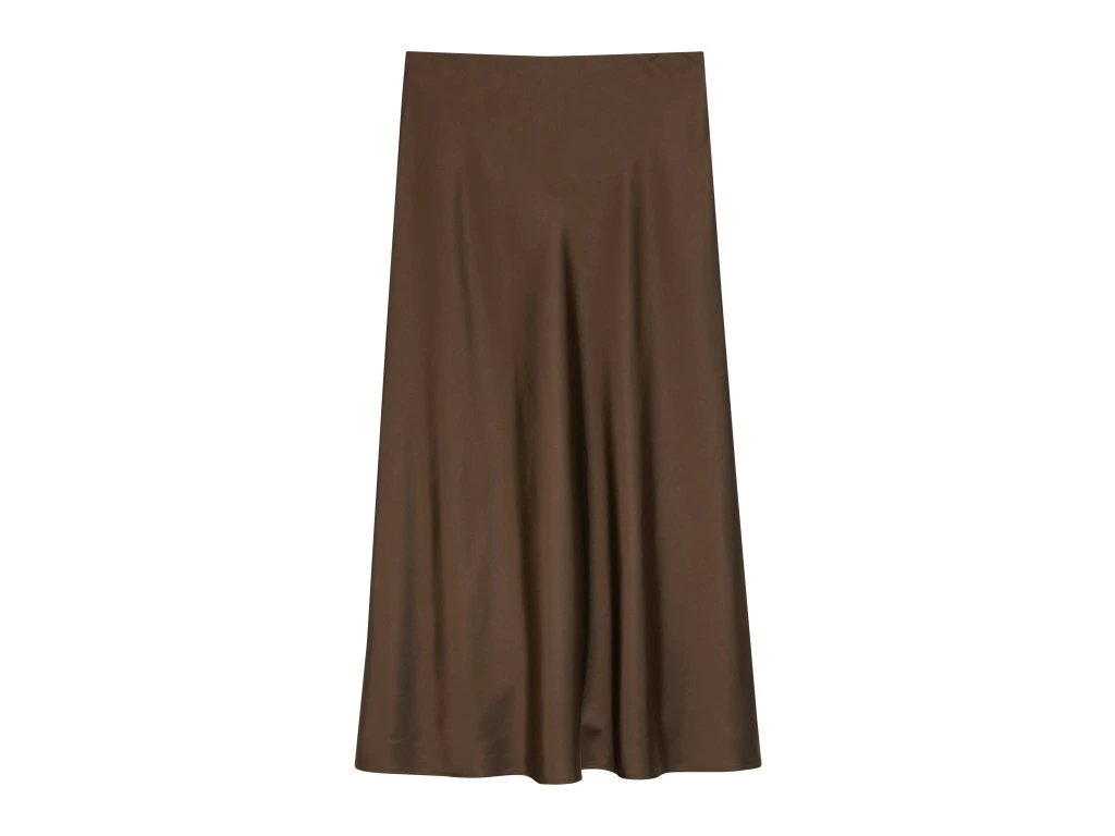Elegantní dámská sukně v hnědém odstínu zaujme svým jednoduchým, ale velmi sofistikovaným designem. Splývavý materiál s jemným leskem krásně kopíruje siluetu a dodává outfitu ženský a nadčasový vzhled.
