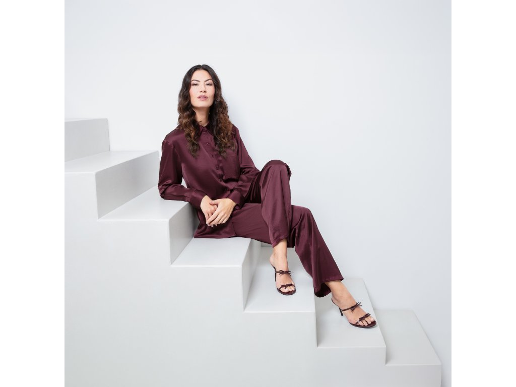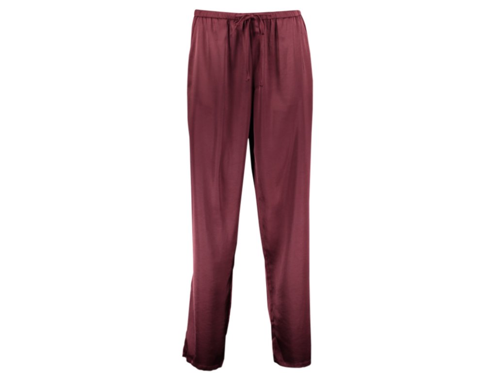 Elegantní volné kalhoty v hladkém bordó provedení, ideální jak pro každodenní nošení, tak i pro ležérně-elegantní outfit. Pohodlný střih s elastickým pasem a šňůrkou na stažení zajistí příjemný komfort během celého dne. Lehký a jemně lesklý materiál dodává modelu sofistikovaný vzhled.