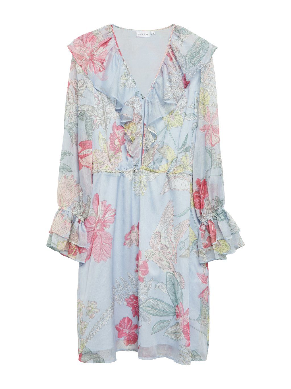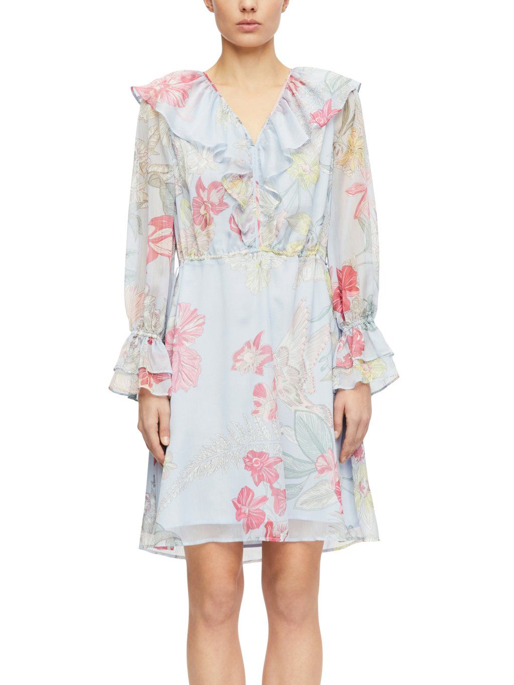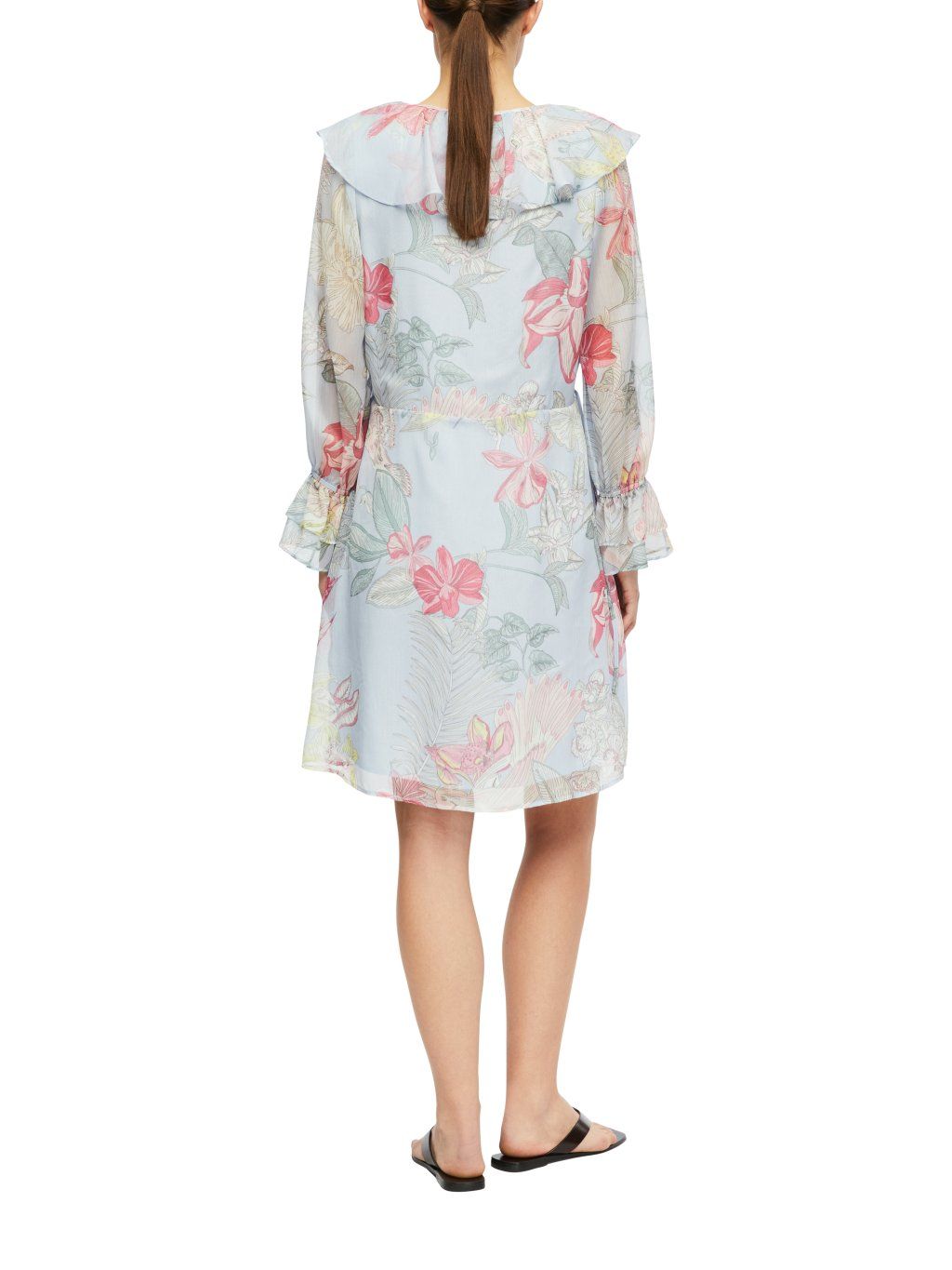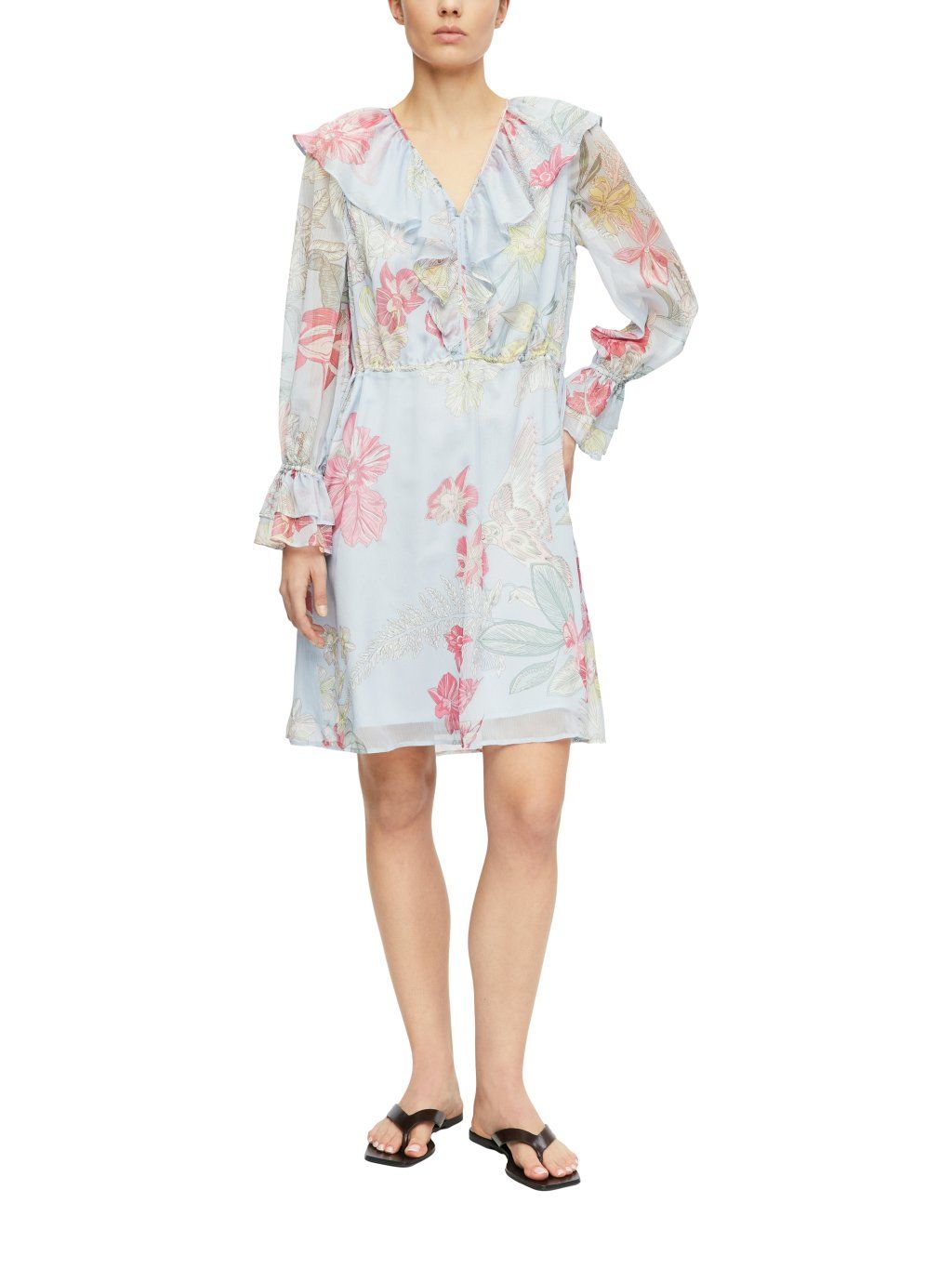 Dominantním prvkem je hlubší výstřih do V doplněný o výrazné volány, které dodávají šatům ženský a elegantní vzhled. Dlouhé rukávy jsou zakončené nabíranými manžetami s volánkem, což celkový design krásně sjednocuje.