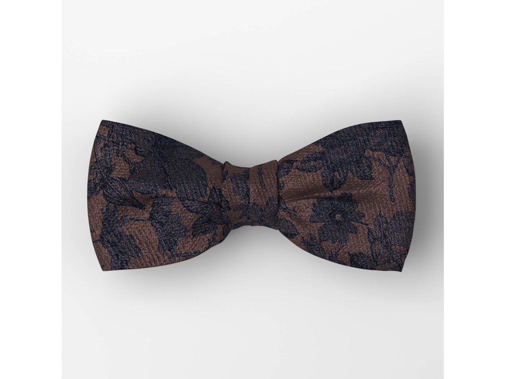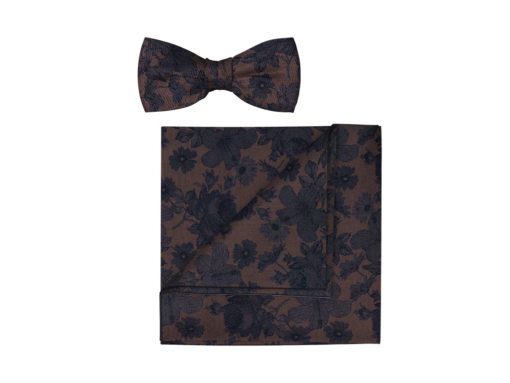 Stylový pánský set tvořený elegantním motýlkem a ladícím kapesníčkem v sytě hnědém odstínu s květinovým vzorem. Jemný lesk a precizní zpracování dělají z tohoto doplňku ideální volbu pro svatby, plesy i další společenské události. Snadno kombinovatelný s jednobarevným oblekem pro dokonalý kontrast.