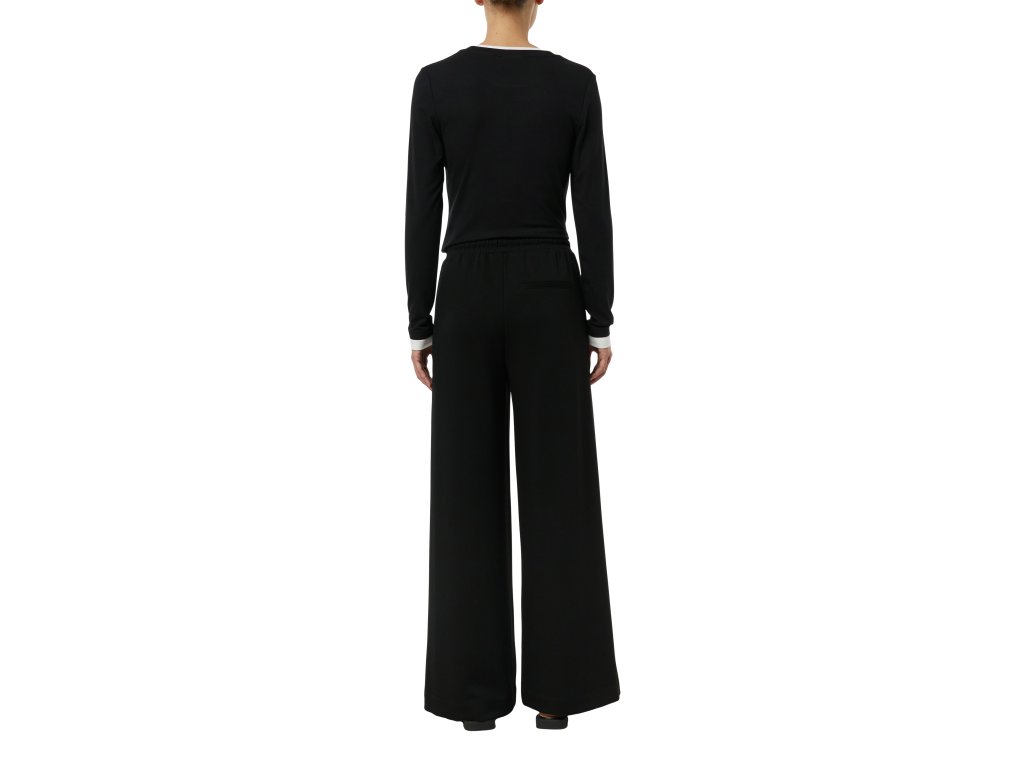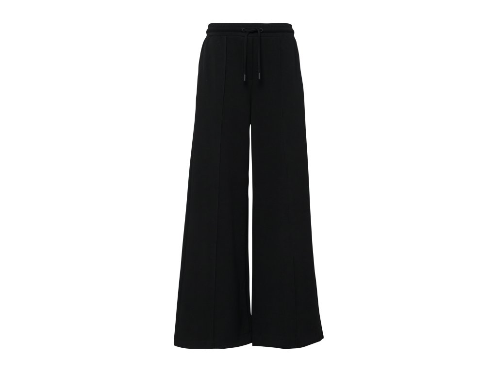Dámské černé kalhoty se širokými nohavicemi spojují komfort a elegantní siluetu. Volný střih a měkký materiál zajišťují maximální pohodlí při celodenním nošení, zatímco elastický pas se stahovací šňůrkou dodává kalhotám uvolněný, moderní charakter. Nadčasové provedení umožňuje snadné kombinování – s topem, košilí i sakem.
