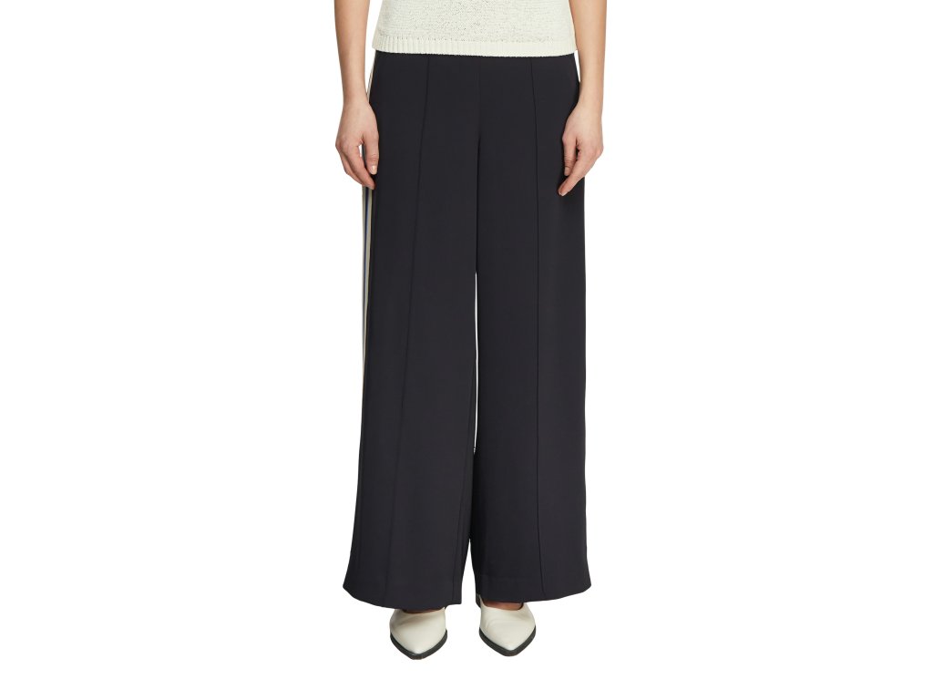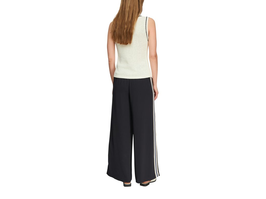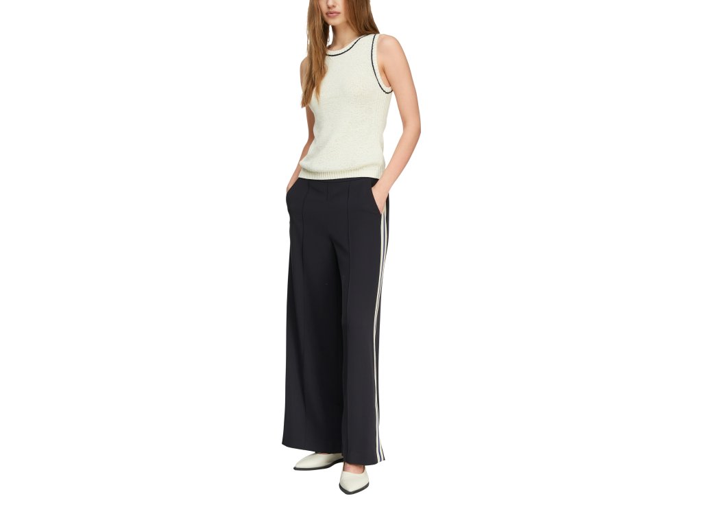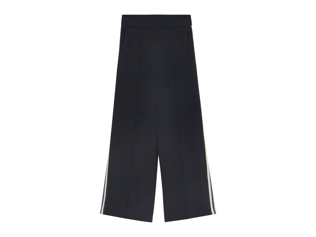 Elegantní dámské kalhoty v tmavě modrém odstínu zaujmou moderním širokým střihem a kontrastními pruhy po stranách nohavic. Sportovně laděný detail dodává modelu dynamiku, zatímco čisté linie zachovávají sofistikovaný vzhled.