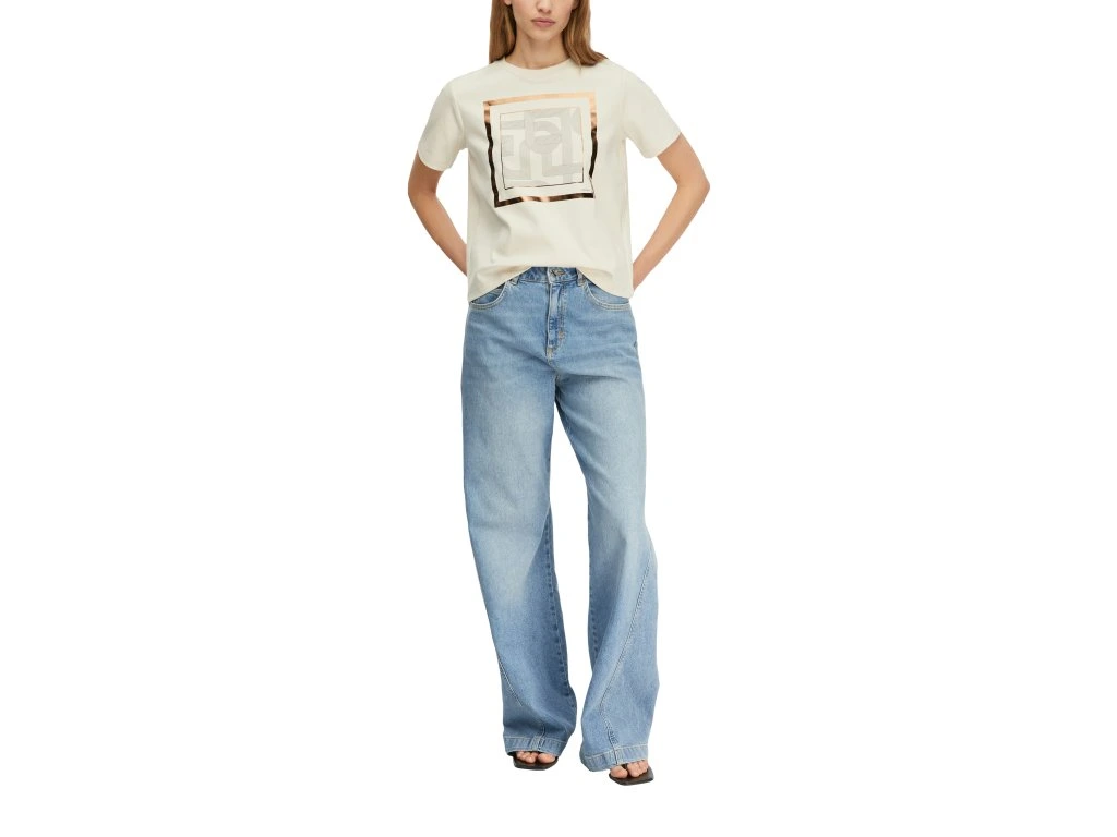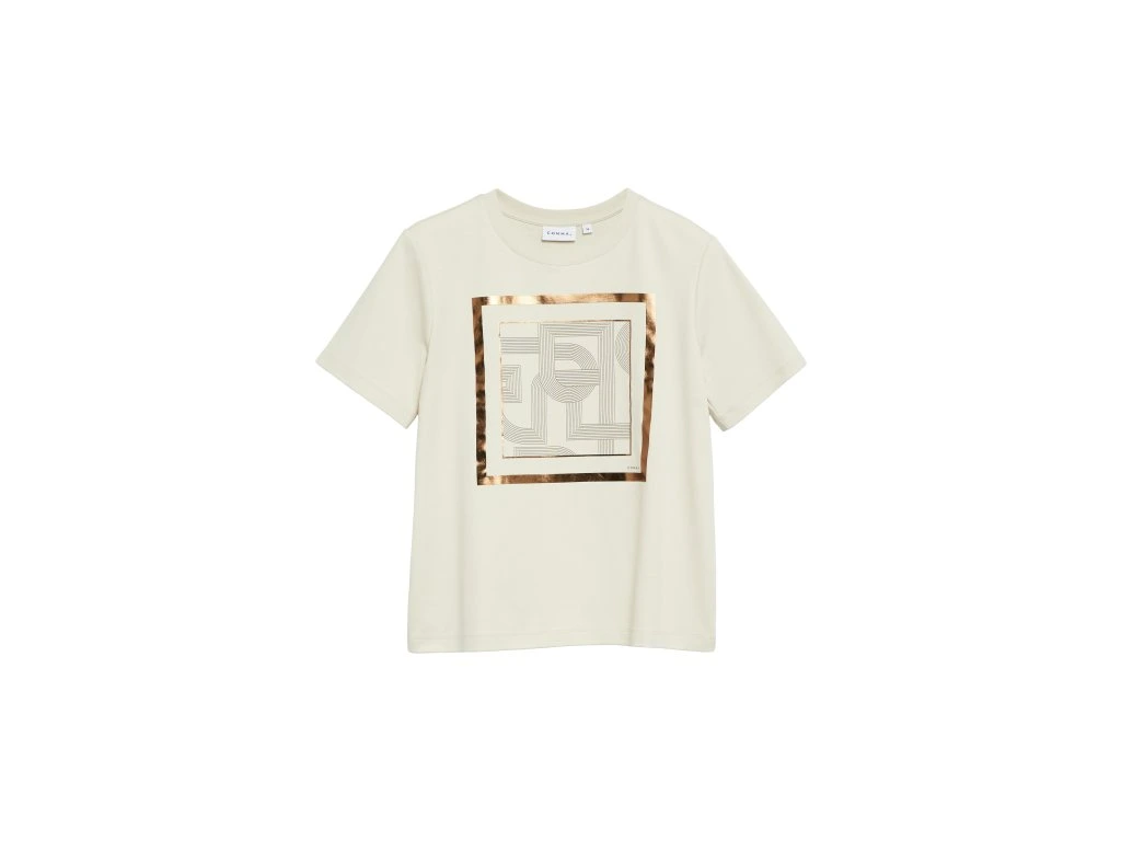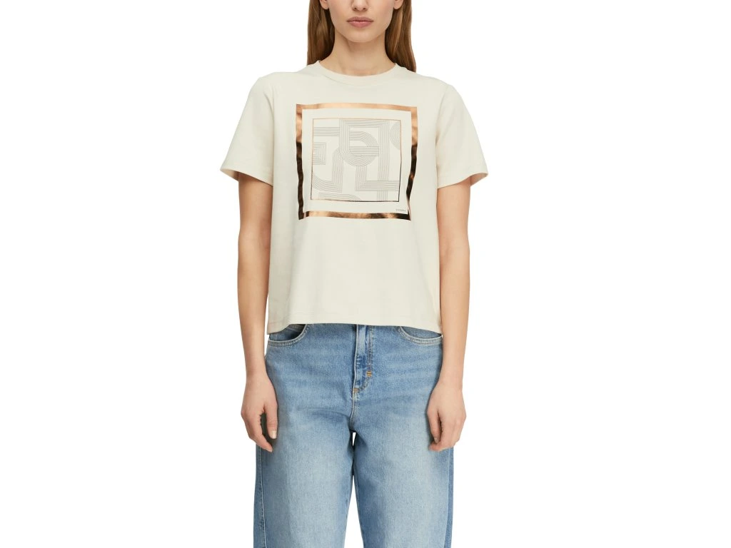 Stylové dámské tričko v krémovém odstínu kombinuje minimalistický design s elegantním potiskem na přední straně. Geometrický motiv doplněný jemným rámem dodává tričku sofistikovaný a moderní vzhled.