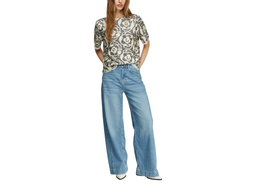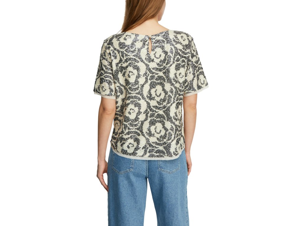 Dámský top s krátkým rukávem zaujme výrazným ornamentálním vzorem v černo-krémovém provedení, který dodává modelu originální a sofistikovaný vzhled. Nadčasová barevná kombinace umožňuje snadné sladění s džínami, kalhotami i sukní.