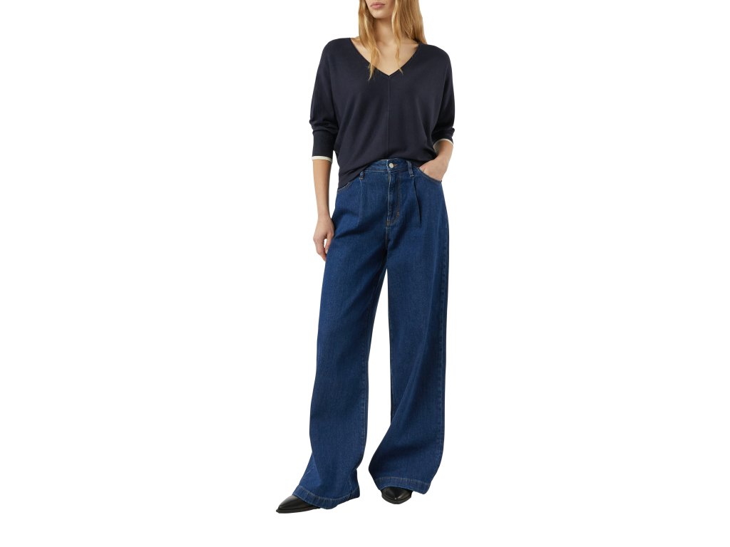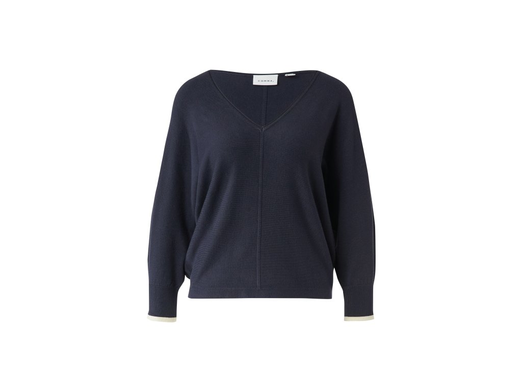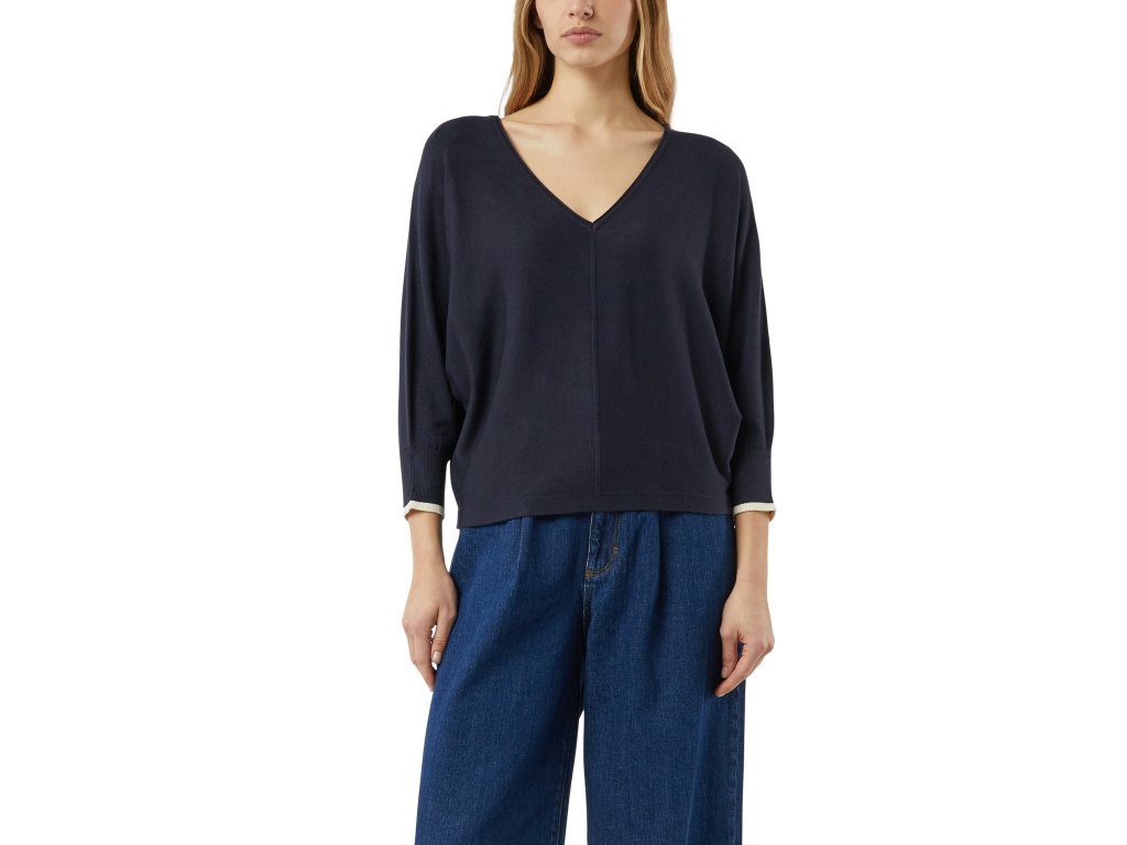 Elegantní pletený top s výstřihem do V je nadčasový kousek, který spojuje komfort s ženskou elegancí. Volnější silueta jemně splývá s postavou a vytváří ležérní, ale sofistikovaný vzhled. Výstřih do V opticky prodlužuje siluetu, zatímco jemné kontrastní lemy na rukávech dodávají modelu moderní akcent.